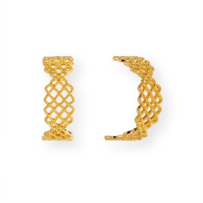 بشكل نصف دائرة عريض ومخرم بلون ذهبي فخم ، تصميم حصري مصنوع من مواد آمنه على الأذن ، لا يتغير لونه مع مرور الوقت عند الحفاظ عليه وعدم تعرضه للعطور او الكريمات المعطره ، يحتوي على الكريستال اللامع ، بحجم خفيف ومناسب لكل وجه.