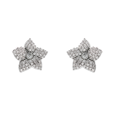 بشكل وردة ولون قاعدة فضي ، يحتوي على فصوص من الكريستالات الصغيره اللامعة ، تصميم حصري مصنوع من مواد آمنه على الأذن ، لا يتغير لونه مع مرور الوقت عند الحفاظ عليه وعدم تعرضه للعطور او الكريمات المعطره ، بحجم خفيف ومناسب لكل وجه.