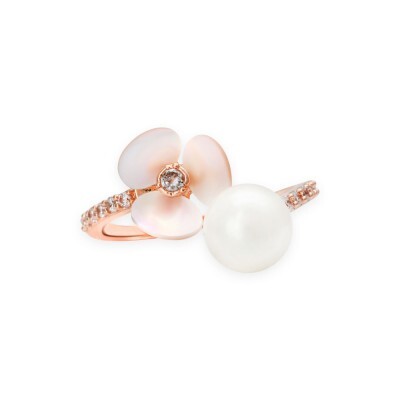 خاتم جذاب مستوحى من جمال الزهور وبياض اللؤلؤ يدمج بين لون الروز قولد وفصوص الكريستال اللامع بتصميم حصري مصنوع من مواد آمنه ، لا يتغير لونه مع مرور الوقت عند الحفاظ عليه وعدم تعرضه للعطور او الكريمات المعطره ، بحجم خفيف.