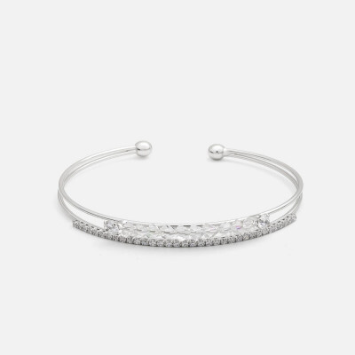 اسوره نسائية بتصميم أنيق بشكل اسورتين متصله معا ، اسورة تتزين بأحجار و فصوص الزركون اللامعه ، اسوارة باللون الفضي، اسواره بنهاية مفتوحة لتتحكمي بمقاسها على يديك، نسقي الإسواره النسائية مع إطلالتك اليومية لطلة أنيقة .