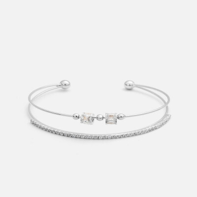 اسوره نسائية بتصميم كلاسيك بشكل اسورتين متصلة معا باللون الفضي باسوره مرصعة بفصوص الزركون اللامعة والاسورة الأخرى تتزين بحلي اسطوانية تتزين بأحجار الزركون، اسواره بنهاية مفتوحة لتتمكني من التحكم بمقاسها على يديك ، نسقي الإسواره النسائيه مع إطلالتك المسائيه لطله أنيقه .