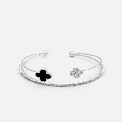 اسوره نسائية بتصميم أنيق بشكل اسورتين متصلة معا باللون الفضي وتتزين اسواره بفصوص الزركون اللامعة والاسواره الأخرى تتزين بحلي بشكل ورد بلون أسود ، اسواره بنهاية مفتوحة لتتمكني من التحكم بمقاسها على يديك ، نسقي الإسواره النسائيه مع إطلالتك المسائيه لطله أنيقه .