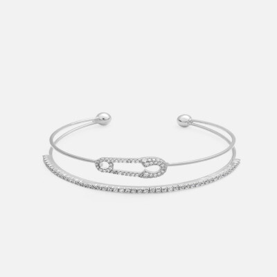 اسوره نسائية بتصميم جذاب بشكل اسورتين متصلة معا باللون الفضي بشكل مفرغ من المنتصف وتتزين بحلية مرصعة بفصوص الزركون اللامعة ، اسواره بنهاية مفتوحة لتتمكني من التحكم بمقاسها على يديك ، نسقي الإسواره النسائيه مع إطلالتك المسائيه لطله أنيقه .
