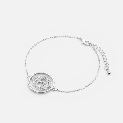 اسوره نسائية بتصميم جذاب، اسورة تتزين بحلية بشكل دائري مفرغ و مرصع بفصوص الزركون ، اسوارة باللون الفضي ، اسواره بقفل متعدد المقاسات لتتحكمي بمقاسها على يديك ، نسقي الإسواره النسائية مع إطلالتك اليومية لطلة أنيقة .