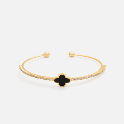 اسورة نسائية بتصميم جذاب باللون الذهبي ، صممت هذه الأسوارة بتصميم مميز وخفيف تتزين الاسوره بفصوص الزركون البراقه وتتزين في المنتصف بحلية بشكل وردة باللون الأسود، اسواره بنهاية مفتوحة لتتحكمي بمقاس الاسوره على يديك ، نسقي الاسورة مع طلتك اليوميه لتضيفي إليها المزيد من التألق .