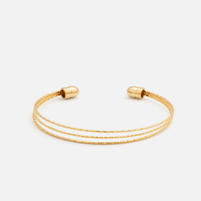 اسوره نسائية بتصميم متفرد بشكل ثلاث اساور متصلة معا باللون الذهبي ، اسواره بنهاية مفتوحة لتتمكني من التحكم بمقاسها على يديك ، نسقي الإسواره النسائيه مع إطلالتك المسائيه لطله أنيقه .