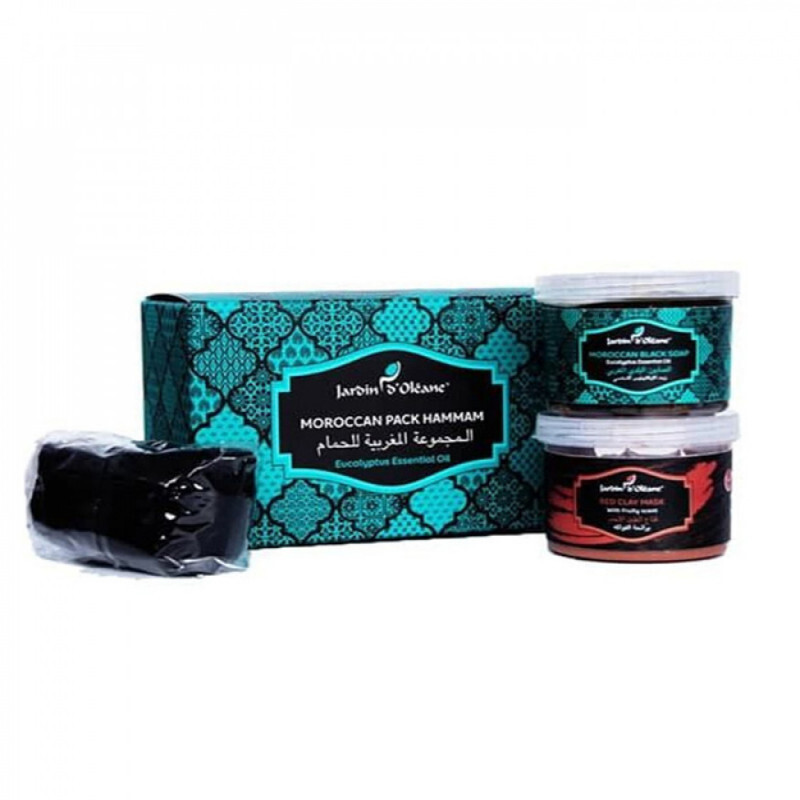 المجموعة المغربية للحمام بزيت الأوكاليبتوس الأساسي وقناع الطين الاحمر من جاردن دي اوليان :