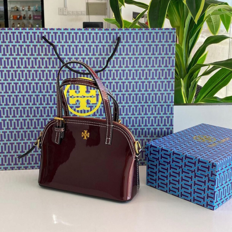 شنطة توري بورش Tory Burch طبق الأصل مصنوعة من الجلد اللامع الفاخر بلون عنابي جذاب مع تفاصيل معدنية ذهبية. تصميم كلاسيكي بمقبض يد علوي وسحاب علوي للإغلاق، وتأتي مع حزام كتف طويل قابل للإزالة، لتناسب جميع إطلالاتك اليومية والمناسبات.