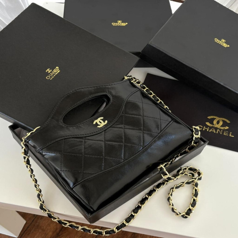 شنطة شانيل CHANEL طبق الأصل بتصميم أنيق وعصري، بحجم صغير مثالي للطلعات والمناسبات. مصنوعة من الجلد الفاخر بلون أسود مع لمسات ذهبية فخمة، وتتميز بيد علوية مدمجة وسلسلة كتف معدنية مدمجة بالجلد لمظهر فاخر ومريح في الحمل. الشعار الذهبي الأيقوني يضفي لمسة كلاسيكية فاخرة.