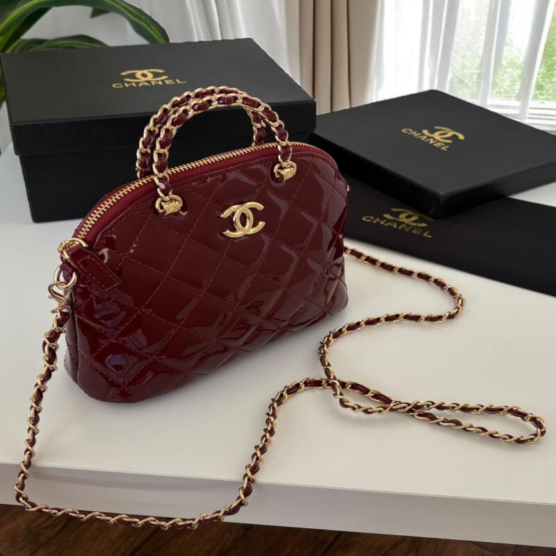 شنطة شانيل CHANEL جلد لامع – عنابي × ذهبي (حجم صغير)