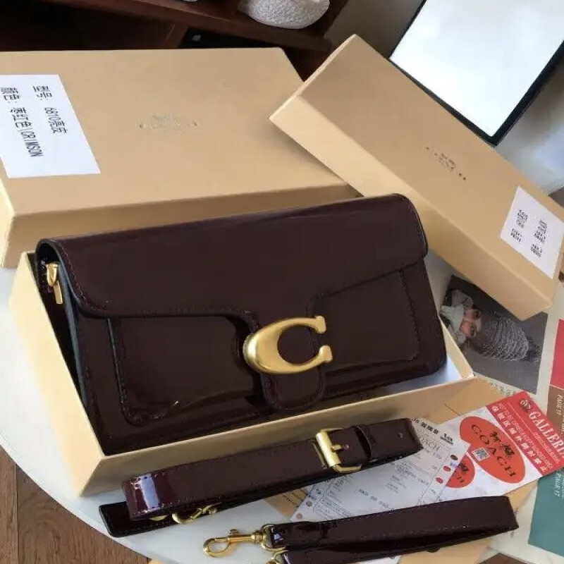شنطة كوتش تابي COACH طبق الأصل بلون بني غامق لامع، تصميم أنيق بخامة جلدية فاخرة ولمعة مميزة تضيف لمسة فخامة لإطلالتك. مزودة بإغلاق مغناطيسي بحرف “C” الذهبي الشهير، مع حزام قابل للتعديل لتناسب جميع الأوقات.