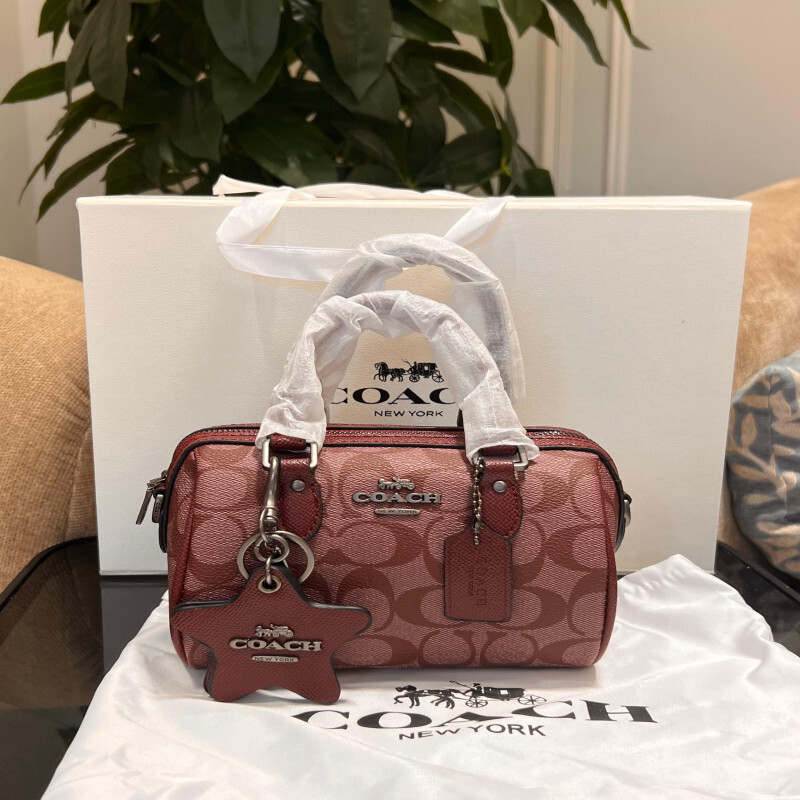 شنطة كوتش COACH طبق الأصل بحجم ميني صغير بتصميم عصري عملي، بلون بورغندي فاخر ونقشة الشعار الكلاسيكية. مزوّدة بيد علوية أنيقة وتعليقة نجمة تحمل شعار COACH لإطلالة مرحة ومميزة. مثالية للاستخدام اليومي أو الطلعات السريعة.