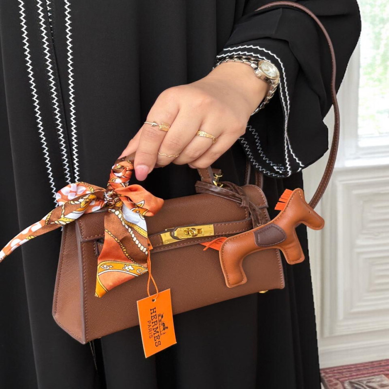 شنطة هرمز Hermès Kelly طبق الأصل بحجم ميني صغير وتصميم أيقوني فاخر بلون بني أنيق، مزوّدة بإكسسوارات ذهبية فخمة، وسكارف حريري معلق على اليد، بالإضافة إلى تعليقة الحصان الكلاسيكية من هيرميس. قطعة مثالية للمناسبات الراقية والطلعات الفخمة.